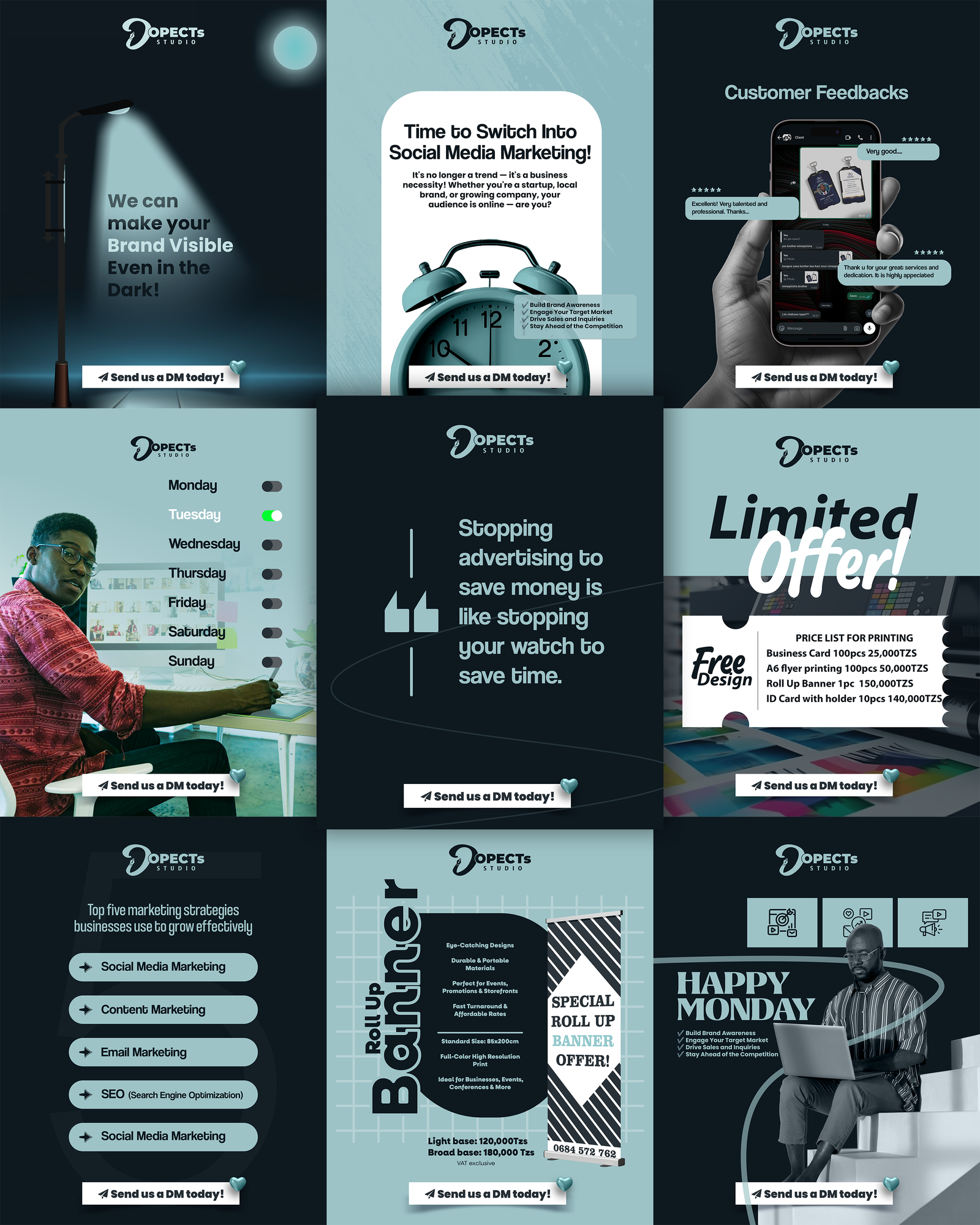 At Dopects Studio, I have led the design of a wide range of posters that blend creativity with strategic messaging. Each poster is tailored to communicate a specific goal — whether for marketing, awareness, or event promotion. By combining bold visuals, clean layout, and audience-focused messaging, my poster designs not only grab attention but also drive engagement and brand consistency across digital and print platforms..